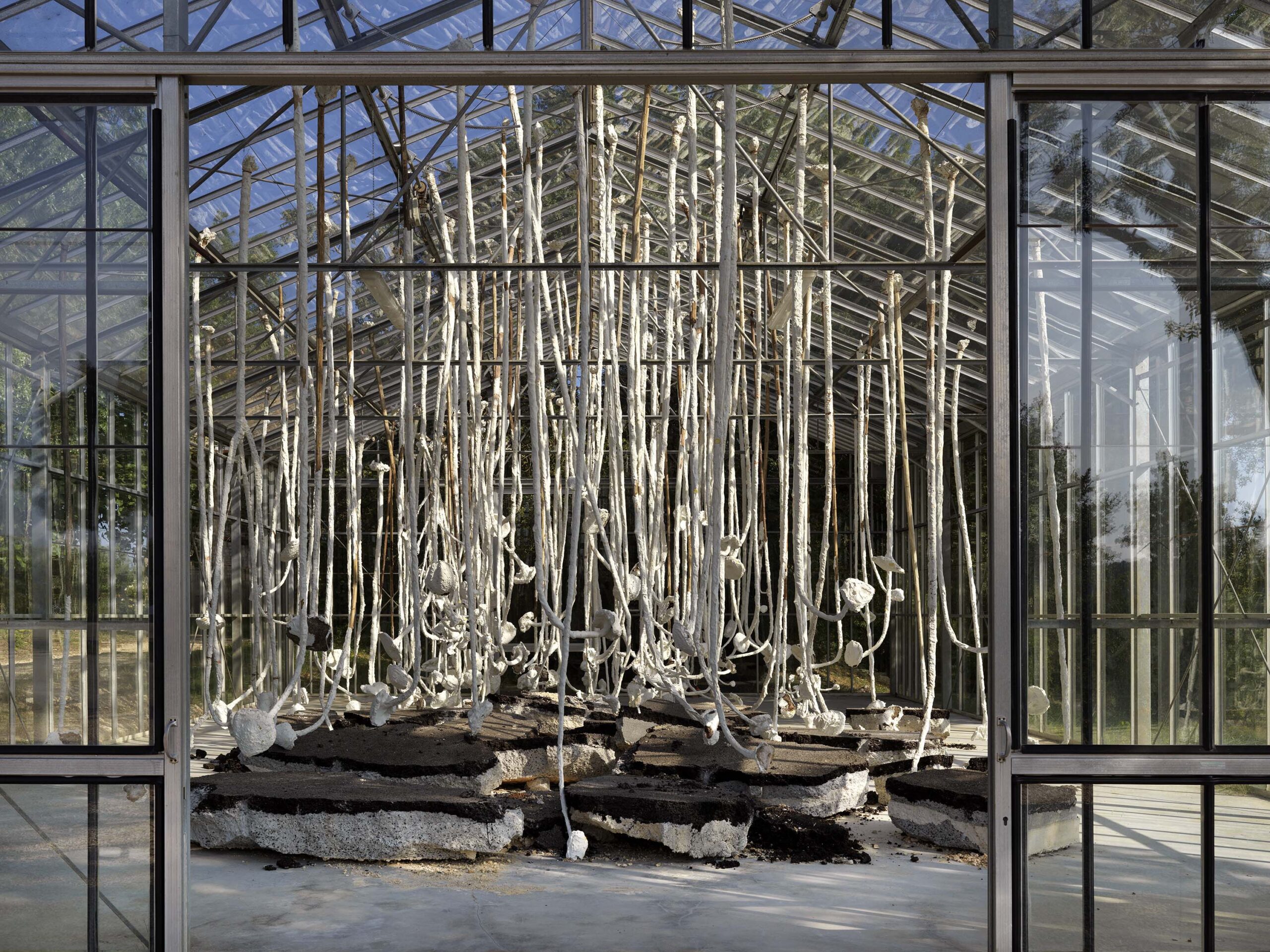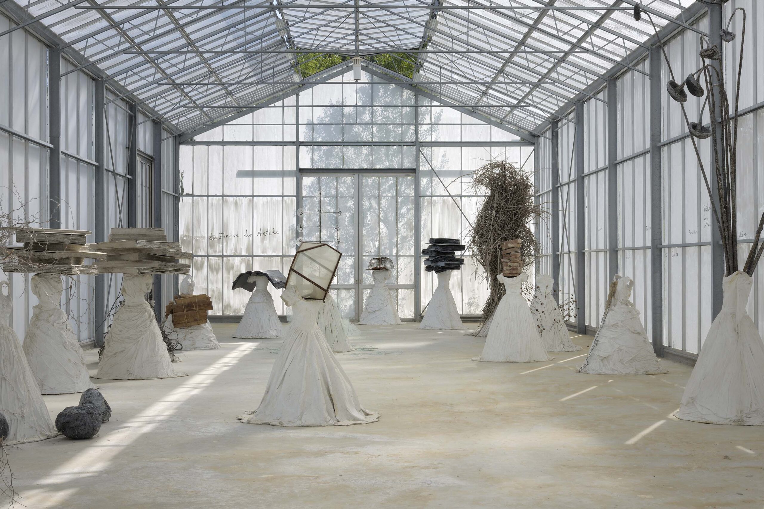 Naast het terrein met de torens staan enorme kassen waarvan de ramen door Kiefer zijn witgeschilderd. Daarin staan ‘bruiden’, verwijzingen naar vrouwen uit de klassieke geschiedenis met in plaats van hoofden bakstenen, boeken, slangen of prikkeldraad; al naargelang hun prestaties. De gids begeleidt ons via diverse installaties boven- en ondergronds uiteindelijk naar een immense hangar voor zijn meest recente werk.